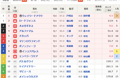 今日は馬券を買う。手を出すのは根岸ステークス。◎は9.エンペラーワケア(西村 淳也、2番人気)。エア馬券予想では9の単勝としたが、リアル馬券は9の複勝を買う。13時35分現在、9.エンペラーワケアの複勝は1.6~2.2倍。9の複勝を5,000円買う。1.8倍はついてほしい。