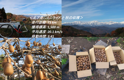 午前中はロードバイクでちょとだけ走り、午後は庭のキウイの収穫をした。 午前の部:北ア見にミニライド(→73km、↑1,500m、4h) 昨日よりも良い天気になったので、冠雪した北アルプスを眺めるためにロードで大岡へ行くことにした。 8時半にGIOS号で出発して、南へ向かい、表側から茶臼山へ登る。 川中島CCまで登り、その先の展望ポイントへ下る。 展望ポイントで北アルプスを眺めた。 大岡まで行かなく…