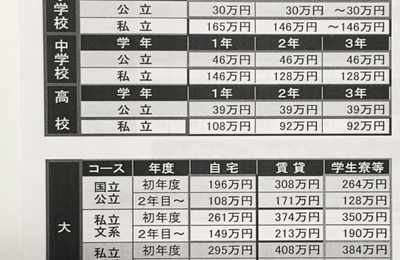 子供がまだできる前、教育費がどのくらいかかるもので、どのくらい準備しておけばよいのかをほけんの窓口に相談に行きました。 その時の資料がとても役立ちそうだったので、掲載します。 教育資金平均データ まず、幼稚園~大学までにそれぞれかかる教育費(教育資金)を教えていただきました。 (ライフプランシミュレーションより)