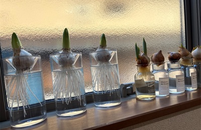 少し前にアップした、ヒヤシンスの球根、このときはまだ小さい芽でしたが、全てきれいに咲いてくれました! 左の3つがヒヤシンス、右の4つはチューリップ。 窓辺にたくさん並べて、毎日根や葉が伸びていく様子を見て楽しみました。 つぼみがついたな、と思ったらあっという間に花が咲きました。栽培を始めて数週間で満開に!咲くと花はかわいいし、清らかないい香りです。 白、ピンク、赤を買ってみました。 この手前はクロ…