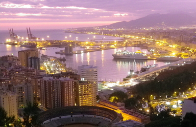 マドリードから、スペイン南部のマラガへ… 12月25日の朝、電車に乗ります。 クリスマスの朝と言うこともあってか、家族連れが多く、 小さな子が大きなおもちゃの箱を大事そうに抱えて歩いていたり…微笑ましい。 マラガに着くと、 そこは、マドリードやトレドとは別世界… 明るく暖かい…南国のような陽ざしです。 (パラドールから、マラガ湾と闘牛場を望む) タクシーに乗って、丘の上のホテル「パラドール」へ… …