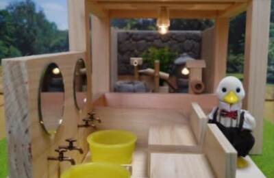 ミニチュアの檜風呂を作りました! ※設定では「DIY好きなアヒルのお父さんが創作するお話」にしています。 アヒルのお父さん。 何やら考え事をしています…💭 「この庭に、みんなで入れる広いお風呂があったらいいだろうな✨」 アヒルのお父さんは、さっそく木材を切ってお風呂を作る準備を始めました。 浴槽が完成! 「さて…今度は、雨が降っても濡れない屋根も作ろう💡」 屋根用の木材をカットした後、アヒルのお母…
