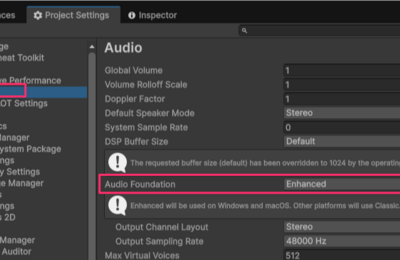 この記事でのバージョン Unity 6000.3.4f1 はじめに 自分の環境(Mac)でUnityを使っていると、スピーカーからイヤホンに切り替える時などに以下のようなログが出て、音が聞こえなくなる事がよくありました。(Unity以外の音は聞こえる) Forced to initialize FMOD to to the device driver's system output rate 24…