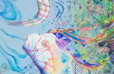 龍の絵がだいぶ進んだけれど、これは2月に出品予定のもの。 もう一枚同じ大きさで似たようなテイストの絵を描きます。 サイズはインチサイズ。「インチサイズの絵を描くよ」と言うと、「それは何インチ?」と聞かれるけど、10インチ×8インチかな。254ミリ×203ミリ。 以前描いたリュウグウノツカイの大きな絵があるので、それをイメージして小さめに描きなおす。 背景は今年描いた抽象画をもったいないけどインチサ…