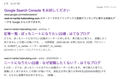 どうも、ぼっちニートになりたい22歳のニーターでございます。 はてなブログを始めて1週間ほどになりますが、Google Search Consoleにインデックス登録されない。 端的にいうと、自分のブログ記事をグーグルで検索しても出てこないといった状況です。 下図のように、「site:」+「ブログのトップページURL」で出てくる記事が、google先生に認識されているものらしいです。 現時点での僕…