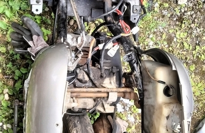 スクーターの修理をしていた。 スクーターは今まで4台くらい直した経験がある。 が、修理するにしても売るにしても、小型機械と比べるとどうしても大がかりになってしまうので好ましくない。なのに、安い!と買ってしまった。まぁせっかくなんで記録。すぐに売るつもりなので、車種とか詳しく書かないことにしよう 笑 ↓ 作業途中 外装は外しています。 まず、コレ竹ヤブから拾って来たの?というくらいボロくて絶句。安い…
