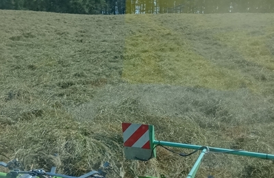こんにちは 台風が上陸していて本州のほうは大変みたいね。 こちら道東は快晴、気温はそんなに高くなくて24℃かな 草の収穫日和であります!! こんな天気を、まってたよーーー ピッちゃん、もう少し天気もたせていてね! 昨日ディスクモアーで刈って、今日は1日テッダーで散らしております ここは18ヘクタールある一番うちで大きな牧草地。 って面積をいわれてもピンとこないよね ここの牧草地は私たちが持っている…