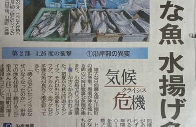 昨日の新聞トップ一面です。今日も同じシリーズでした。 昨日も触れましたが、農業や漁業等自然を相手に仕事をされてる方等でなくてもかもしれませんが、確実に変化してますよね。 私は釣りをするので釣りは小学生の頃から川で、成人になり海へって感じで今まで趣味としてやってましたが、同じ川でも地形(川幅等)変わってるし、海も釣れる魚が変化してるし、水温を気にする釣りですが、今の時期にこの魚?って事も増えてきまし…