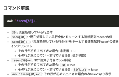 awkで簡単にできます: awk '!seen[$0]++' はじめに コマンドで重複行を排除して一度だけ表示する コマンド解説 実行例 おわりに 参考 はじめに コマンドで重複行を排除して一度だけ表示する方法の備忘録を残します。 The English translation of this post is here. コマンドで重複行を排除して一度だけ表示する 下記コマンドで、重複行を排除して…