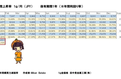 2026年1月の金価格月間高値、年間平均値が確定しましたのでお知らせします。金 1月の高値:1g単価 29,815円 金 1月の増減率:+87.41%(年利回り率・1年間保有時の増加率) 2025年度の年間平均利回り確定値は +38.22% 表の数字は各月間の金価格高値を抽出しています。今月は金と銀が記録的な高値を更新し続ける中で87.41%と驚異的な値を達成し上昇トレンドを継続しています。特に昨…