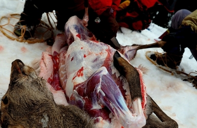 朝、突然携帯が鳴り響いた。金山町のヒーロー昭夫さん(マタギ)からだった。「今から山に行かないか?」「行きます!」 寸秒たたずの即答だった。マタタビ細工の予定が入っていたのだが、山に一瞬のうちに押し潰された。 1月には珍しいという冷たい雨のなか、静かな木々の間、深い雪の上をかんじきで歩いてゆく。 前にあるのはライフルを抱えた昭夫さんの偉大なる背中。 神経を周囲に傾け、会話は一切ない。 それは今までの…