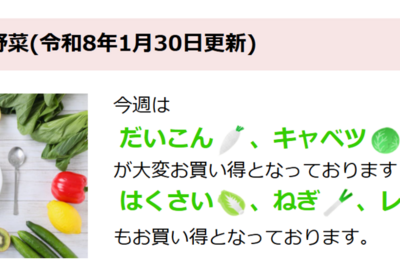 最近、スーパーに行くたびにキャベツを買っています。 まだ冷蔵庫にあるのに、「1玉98円」のPOPを見ると、ついカゴに入れてしまいます。 キャベツ鍋や煮物をメインにほとんど毎日キャベツを食べて、食べに食べて、今も冷蔵庫に2玉残っています。 サイトに載っていたのをふと思い出して見に行くと、やっぱり全国的に安くなっているみたいです。 今週のおてごろ野菜(農林水産省のHPから引用) だいこん、はくさい、ネ…