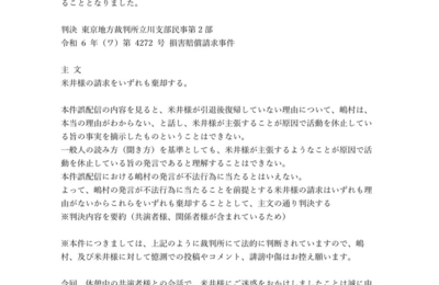 ※本ブログは敬称略で書きます。 本記事の位置づけ 本記事は、タレント嶋村瞳と元ボートレーサー米井里実との間で争われた民事裁判(東京地方裁判所立川支部民事第2部 令和6年(ワ)第4272号 損害賠償事件)について、公開情報や裁判記録の閲覧をもとに筆者が整理した内容と所感をまとめたものです。 裁判記録は誰でも閲覧することができます。ただし、裁判記録は閲覧時に簡単なメモを取ることしかできず、記憶に基づく…