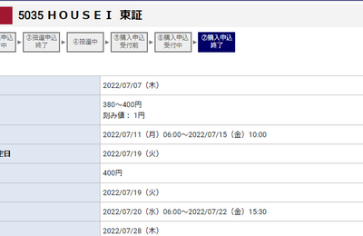 2022年初のIPO当選です。 本当に、久しぶり!! 今年は、相場が良くない雰囲気で、IPO投資が微妙だな~と・・・ とりあえず、当たらなくても、SBIポイントを貯める目的で、ゆる~く参加していたので、当選の2文字を危うく見落とすところでした。 IPO当選 当選を頂いた証券会社は、みずほ証券です。 銘柄は、【HOUSEI(5035)】400円を200株購入です。 ネットの情報では、Bランクだったの…