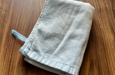 OUT #1164 ハンドタオル 子どもが保育園に通っていた際に持たせていたハンドタオルだ。卒園後もなんとなく保管していたが、昨年からキッチン用ハンドタオルとして活用していた。使い古して生地がだいぶ傷んできたので処分することにする。床の拭き掃除等に活用してから廃棄しようと思う。