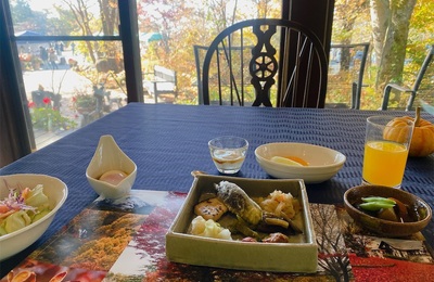 朝も冷えるから、起きてお風呂に浸かりながらパックして準備🧖🏻♀️ 8時から朝ごはん。夜が洋食だったので朝は和食をお願いしました。 紅葉を見ながらゆっくり。お味噌汁が沁みた〜〜〜 飲み物類がセルフサービスなのも気楽で良かった。 ゆっくり過ごさせてもらった。 そのあとチェックアウトして荷物を預かってもらって、萌木の村の散策に出かけたよ。ちょうど年に一度のカントリーフェスタをやってて、この辺りでは結構…