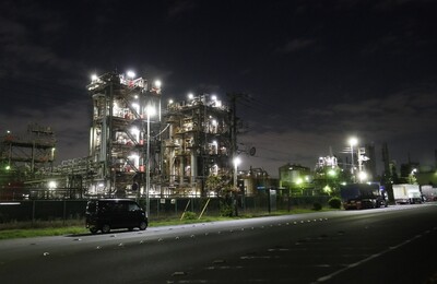 (261/815) 川崎市では工場夜景を見に行くことにしました。川崎市の工場地帯に行くのは半世紀以上前の大学時代、東芝浜川崎工場に見学に行って以来です。 川崎駅近くのホテルにチェックイン後、バスで工場夜景お勧めスポットの一つ市営埠頭まで行きました。途中までは仕事帰りの通勤客でいっぱいでしたが、工場地帯のバス停で降りる頃は乗客は私一人でした。 バス停近くから見えたのがこれ。 街灯は灯っていますが辺り…