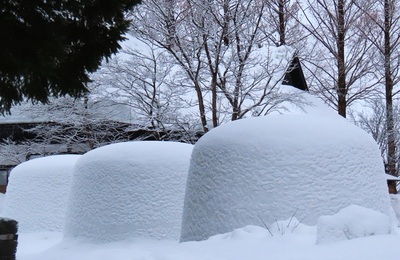 こんにちは~ 今日は曇り、最高気温6度、最低気温-1度の予報です。 でも今はお日様が出ていてとても穏やかでいいお天気になっています。 このまま春に向かう?なんってつい思ってしまいますが まだ2月ですからねえ~~~(苦笑 さてさて今日は昨日の続きですよ 村には大きなかまくらが4基作られています かまくらは高さ3m、直径3.5mととても大きなものですよ 初めて見た方は大きさに驚きます。 古民家とかまく…