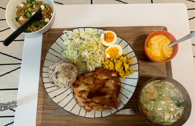 今日はお昼ご飯はパリパリチキンと決めて。 かぼちゃとひじきとチーズのマヨ和えと一緒に。お腹いっぱい。