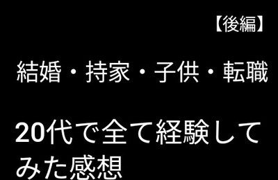 結婚、持家については前編でお話しました。 後編では、子供と転職について深堀りしていきます。 【目次】 1.子供 1-1.妻が妊娠した時に夫として気を付けることは?? 1-2.出産立会はすべき?? 2.転職 2−1.20代での転職について 2−2.転職リスクについて 3.まとめ 1.子供 子どもは、私が27歳と29歳のときに生まれました。 結婚は23歳でしたので、結婚して約4年後に第一子が生まれまし…