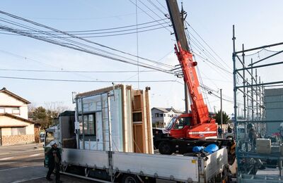 昨日は七尾市万行にて弊社が担当するいしかわ型復興住宅モデルの上棟がありました。今回はいつもと違う方法での上棟。トラックに乗っているのは今回初めて使用する大型パネル。群馬県の工場で作ってもらったものです。 大型パネルを吊ってははめ込み、吊ってははめ込みを繰り返して壁を作っていきます。 このパネルには断熱材と耐力壁、防水シートさらにサッシが既に工場にて組み込まれています。こちらの要望に応じてパネルをカ…