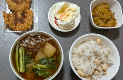 一気に寒い。鼻から吸う空気がひんやりしてる。おでことほっぺたに当たる風が冷たい。手袋をして歩いた。 晩ごはんにはコロッケとヒレカツを買ってきた。おいしかった。みそ汁はモロッコいんげん、大根、小松菜、糸寒天。おいしく作れた。