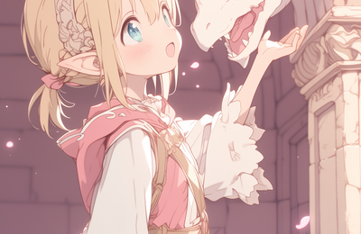 淡い光が差し込む石造りの回廊に、春の風が静かに流れ込んでいた。空から舞い落ちる桜色の花びらが、ゆっくりと床へと降り積もり、まるでこの場所そのものが祝福されているかのようだった。 その中心に立っているのは、小さなエルフの少女。金色の髪は柔らかく結い上げられ、耳は人よりも長く、繊細に空気を感じ取っている。淡い桃色の服は春の花のように優しく、彼女の澄んだ青い瞳は、目の前の存在をまっすぐに見つめていた。 …