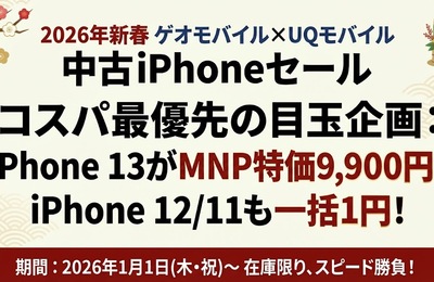 2026年のスマホ初売りで「iPhone購入のコスパ最優先」なら、間違いなくゲオモバイル×UQモバイルの中古iPhoneセールです。 今年の目玉は、なんとiPhone 11/12/12 miniが一括1円〜。 さらに、現役バリバリのiPhone 13もMNPなら9,900円まで価格が落ちています。 「安すぎて逆に不安」「どれを選べばいいの?」という方のために、この記事では価格だけで飛びつくと後悔し…