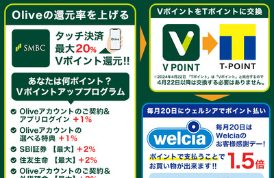 対象店舗でのタッチ決済で最大20%Vポイント還元の三井住友「Olive」で貯めたポイントを全額Tポイントに交換して、毎月20日の「Welciaのお客様感謝デー」でポイント払いすると、1.5倍お買い物が出来ます!!!つまりOliveで最大20%ポイントがつくセブンイレブンで 10,000円買い物した場合、2,000ポイントVポイントが貰えます。 ※還元率は人によって違います。私は現在9.5%です。毎…
