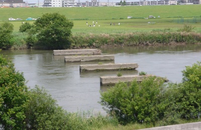 2008年6月15日の江戸川土手。 川の中にあるコンクリートの構造物は初代流山橋のものです。 1935年に架橋され、1965年に現橋ができるまで使用されました。 土手の上を北へ。 平和台付近で土手をおりました。 県道5号線、通称流山街道から西に1本それた路地です。この路地が旧流山街道でした。 長流寺 光明院は、幕末に近藤勇が駐屯した時に隊士の宿泊所になりました。 武蔵野線のガードをくぐって南流山に…