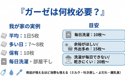 赤ちゃんのガーゼって、最初は「数枚あれば足りるでしょ」と思いがちですが、育児を始めてみると意外と消費します。ミルク後に口を拭く、吐き戻しを受け止める、よだれを拭く、離乳食中に口まわりを拭く。こうした“拭きたい瞬間”が1日の中で何度も来るからです。 この記事では、生後9ヶ月の我が家の実例(ガーゼ10枚運用、平均1日5枚、多い日は7〜8枚)をもとに、「結局何枚あれば困らないのか」をなるべく再現しやすい…