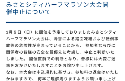 2/8のみさとシティハーフマラソン、 中止になっちゃいました。 選挙による中止を回避したのに、 まさか雪の影響で中止になるとは…。 自分予想だと積雪は無いとみてます。 でも、道路の凍結はちらほらありそうだし、 ボランティアの方々は寒くて可哀想だし、 中止という判断は仕方無いかな。 初めて出る大会で楽しみにしてましたが…。 という訳で東京マラソン3週前の大事なランが 無くなってしまった。 しっかりゼ…