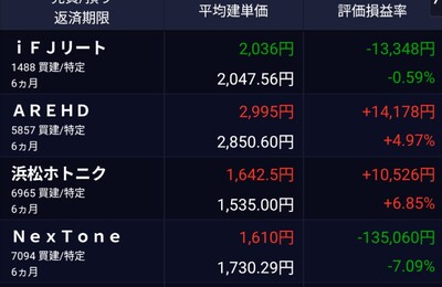 資産評価額は前日比+441,923円⤴️ 今日も我慢か‥と思っていたら、寄りからどんどんあがってびっくり😳 我慢が続いてた持ち株も良い感じに😳おかげで浜松ホトニクスを現物単価下げしたうえに少し利益も出ました㊗️ 信用建玉 ホトニクス、残った100株は明日現引予定です。 サンリオも100株だけ返済しました。 他には、iFJREITを追加、平和不動産を100株新規で買いました。 あとはNexToneが…