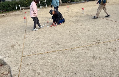 今日楼人会のペタンク大会が開催されましたので参加してきました。 ペタンク競技は赤と白の2組みに分かれ、小さな玉に対して各人が大きい鉄製の玉を投げ如何に近づけるかを競う競技です。 各組5名前後の人が1ゲーム1回ずつ投げ合います。 得点が13点で終了します。余り力も必要ありませんし老若男女誰でも参加出来るし面白い競技です。 得点を計算中 コートは広くありません。