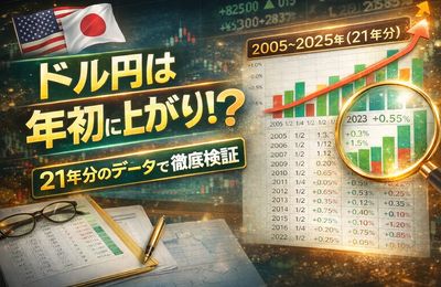 年初のドル円は上がりやすい。FXをやっていると、そんな話を一度は聞いたことがあるのではないでしょうか。では実際に、年初の最初の営業日でドル円はどれくらい動いているのか。この記事では、2005年~2025年の21年分データを使い、 年初営業日の「始値→終値の変化率を検証します。 年初最初の営業日|始値→終値変化率(USD/JPY) 期間:2005年~2025年| 年 年初営業日 変化率(始値→終値)…