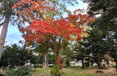 約一年ぶりの空知神社にお参りしました。 hokkaidojinjacho.jp 前述の大願神社へもお参りしたため、到着時刻は16時。 社務所は閉まっている時間でした。 手を清めるのも冷たくて辛い季節になってきましたね。 拝殿は改装工事中の様子。 賽銭箱のみ前に出てきておりますので、ここでお参りします。 お稲荷さんと紅葉の朱色が、周りの景色に映えて奇麗でしたね。