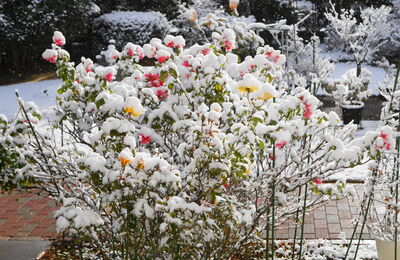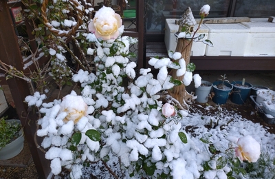 昨日の朝静けさにふと目が覚めて外を見ると、なんと雪景色。 夜中は凄い強風が吹き荒れていたのに静寂の朝を迎えました。 妻は用事があり朝早くに出掛けたので一人でご飯を食べ、床暖房の暖かさを感じながら窓辺の花に水をあげようと向かって行くと・・・ 外の景色にドキッ!! き、、、キレイ!! なんだ、この光景は・・・ 今まで見た事の無い雪を被ったバラの花。 こんな光景が繰り広げられているとは・・・ 赤と黄色と…