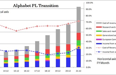 2月1日に決算発表があったのでざっと眺めてみました。 結果は事前に予想されてた内容とあまり違いがありませんでしたが、まずはPLの推移を可視化してみました。 AlphabetのPL推移_2021 21年は前年比で売上(revenueの事で棒グラフの高さに相当)が大幅に上がってます、YoYで41%程です。 コストの伸びは売上の伸びより小さいため営業利益率は大きくなってます。 売上が大きく伸びてもコスト…