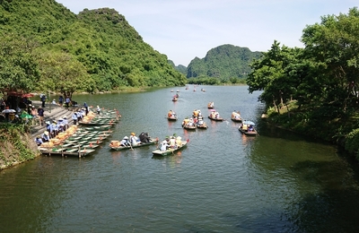 Khu du lịch sinh thái Tràng An(チャンアン景勝地)は、ベトナム北部・ニンビン省にある世界自然・文化複合遺産で、ホアルー古都の近くに位置しています。石灰岩のカルスト地形により形成されたこのエリアは、険しい岩山と透明な川、そして神秘的な洞窟が連なる絶景地として知られています。 観光のハイライトは、手漕ぎボートによる川下りツアーです。現地の女性たちがゆったりと船を漕ぎ、旅行…