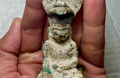 かわいいサイズの仏陀ストーリー(青銅製)を手に入れました。仏陀が悟りの境地に入るまでのきびしい修行中、ナーガ神が雨や風から守ったという伝説の1シーンです。 出土後からそのままの状態ですが表情も見えてなかなかいい風合いです。このような状態をタイ人は「ドゥーム ドゥーム」といいます。ドゥームとはタイ語で「同じ」という意味で出土後や発掘後に(掃除や洗浄など)何も手をつけていない状態のことをいいます。完品…