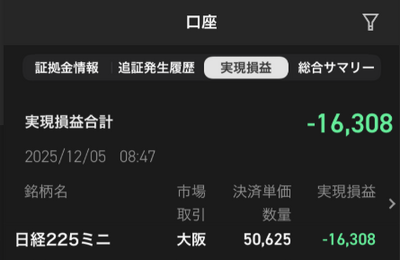 ■トレード結果:2025年12月5日(金) ▶引け成り売りエントリー4枚@50,585▶寄り成り決済4枚@50,625(▲160) ▷本日の損益、 ▲16,308円▷12月累計損益 +52,460円 (03勝02敗、勝率60%)▷年間累計損益 +1,219,104円 (111勝119敗、勝率48%)※証拠金:200万円※取引枚数:先物ミニ4枚