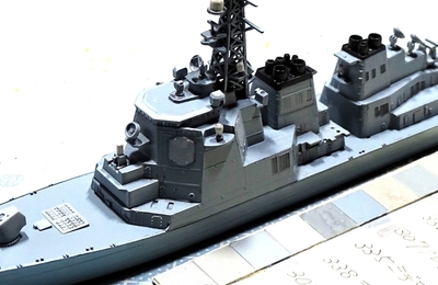 DDG-176 「ちょうかい」 ㈱ハセガワ 1/700 主な上部構造物を船体にくっつけました。 実物はこんなに段差はできません ただ、実物の画像をよく見てみると、艦橋と船体との接合部が連続面になっていて、 段がないように調整が必要でした。 削りだすと、どうもうまく面がでません・・・・・ 舷側が艦橋から後ろにわたって、ヒケが出ていて、 中央部が凹んでいました。 右舷はなんとかなりました 左舷は・・・…