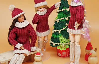 クリスマス第2弾ということで、サンタ風のワンピを編んでみました。 22cmドール(リカちゃん)、27cmドール(#リカシリーズ)、30cmドール(バービーファッショニスタ)に着せています。 サンタといいましたが、がっつりミニスカサンタとかじゃないから、言わなきゃ、ふつーのニットワンピかな。 ボルドーとアイボリーのバイカラーにしたって、だけだし(笑)。 超ミニスカートなんだけど、ドールたちはスタイル…