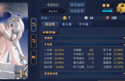 はじめまして! 砂糖玲乃と申します。読み方は「さとうれの」です。つい最近 まで10代やってたごくごく普通の大学生です。(*´ω`) このブログでは四麻歴ほぼ半年(三麻は数年やってます)の駆け出しが、つよつよな打ち手(?)を目指し、日々奮闘する中で感じたことだったりを載せていけたらなぁと思っております。 基本的にリアル麻雀ではなく、ネット麻雀(主に雀魂)でずっと打ってます(雀荘はまだちょっとハードル…