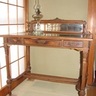 高さ9㎝、幅10㎝の机です。脇机もあります。引出しが出ます。天板を開いて留めるための脇の二本の木を引き出します。天板を開くと、奧に引出しもあります。カバンに吊っていた猿の頭から鎖をはずして座らせる。娘が「るーさ」と名付けていました。大佐中佐少佐、るーさだよん。 2019-3-1