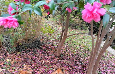 紅葉が終盤になり、次に愛犬たちを撮るとしたら・・・と思って散歩をしていたら、山茶花がいい感じで咲いていました。花びらの絨毯でオスワリをする風愛ちゃんと鈴々ちゃんにポチっと押してください。 ⇦どちらも押してください⇨ いつも押してくださって、どうもありがとうございます。 実は、うちにも山茶花の木が遊歩道沿いにあるんですが、まだ3輪しか咲いていませんでした。 こちらは、桜公園の入り口?付近で咲いていた…