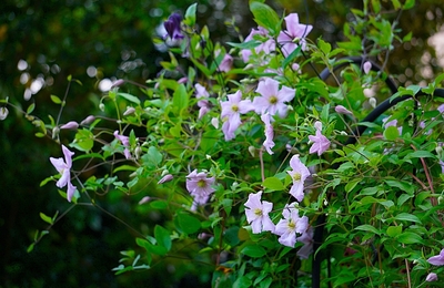 クレマチスを複数組み合わせて咲かせると 単体では出せない色味のバリエーショが楽しめて 結構クセになります。 前回投稿のシロマンエのの向いにあるトレリスで エンテルが咲きました。 エンテルはシェルピンク色(淡い黄色みを帯びたピンク)で 黄色いシベもかわいいビチセラ系 沢山咲かせたかったらビチセラ系だな~と思わせるほどの花付です。 朝の日差しでピンク色がくっきり~☆ この横向きのフォルムが好きなんだな…