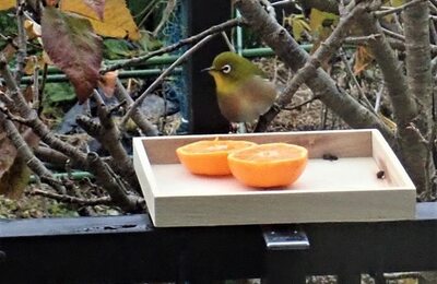 7日以来、メジロは来ませんでした。10日には、カーテンを開けるとヒヨが2羽飛び立ちました。みかんが、風邪でなのか落ちていました。お皿は落ちていません。次の日は、朝起きると、昨日から置いてあったみかんを、食べたかったのか、ヒヨが前の電線に止まってこちらを見ていました。鳥がこない時は、ヒヨでも来てほしかったのに、メジロが来るとそのことも忘れた行動です(笑)。みかんを収めました。ヒヨはすぐ帰りました。今…