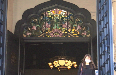 ランチ後、すぐ近くの築地本願寺へ 本堂の入り口です ・・・・お寺さんですか??? 修理中で全景が見えず残念でしたここから見ても、お寺さんに見えない建物ですよね 階段の両脇に阿吽の獅子達は翼あるね! ひげ袋を膨らませてなんだか可愛い顔をしています 自分の目線よりかなり上なので正面から見られない~ 階段を上ると 入り口の素敵なステンドグラスが迎えてくれます その先、大本堂部分の照明も素敵ですよね! (…