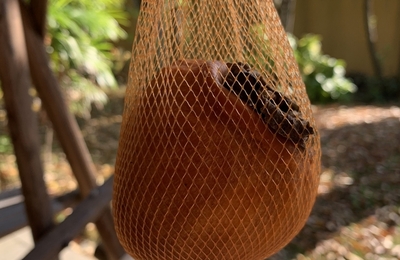 みなさま、こんにちは。先日の干し柿の中間報告です。現在こんな感じ…。1週間に1~2回、パストリーゼでシュッシュッと、一つずつ消毒しております。カビが生えてはいけないと思って。ただ、それが正しいのかどうかはわかりません…。エリちゃんが興味深そうに匂いに来るのですが、食べられないような高さにしているので大丈夫。 少し黒ずんできたのと枯葉が積もってきた以外大きな変化なし パストリーゼで消毒 ワンコと言え…
